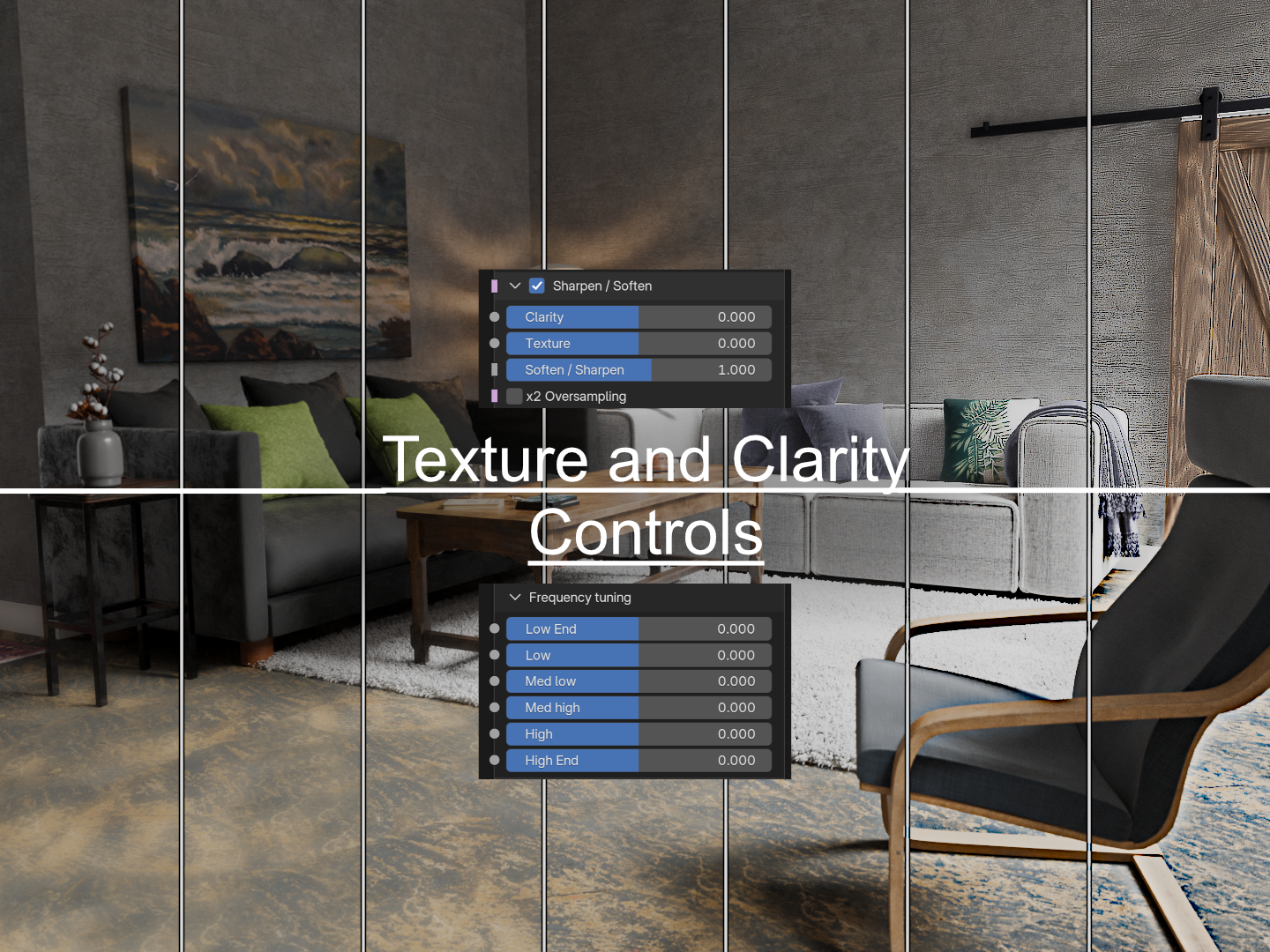 A new way to optimize detail in images. Frequency sharpening Band-pass filters the image in 6 frequency bands. Where you can sharpen or soften the image in those Frequencies only.